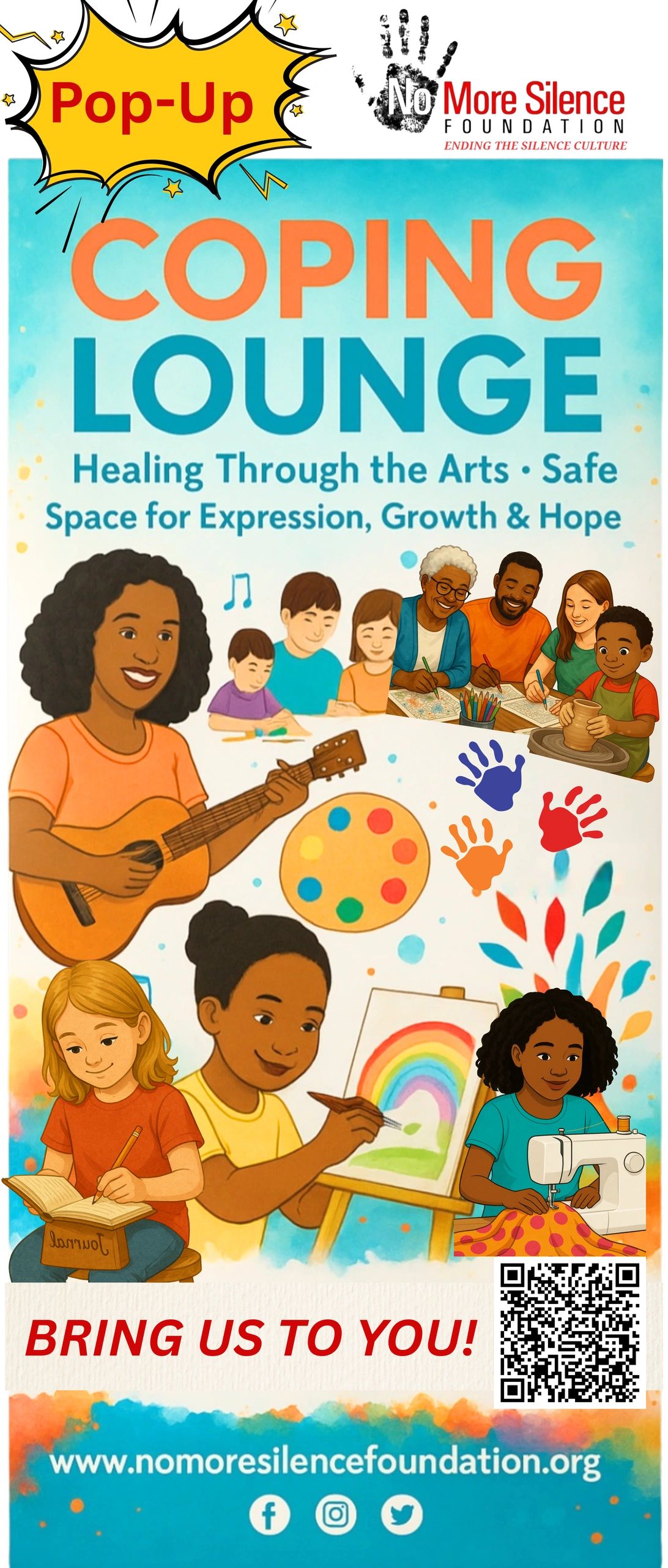 The No More Silence Foundation brings the Coping Lounge to schools, churches, and community spaces, transforming everyday places into safe, creative zones where children, families, and survivors can express emotions, release stress, and rediscover hope through the arts.
